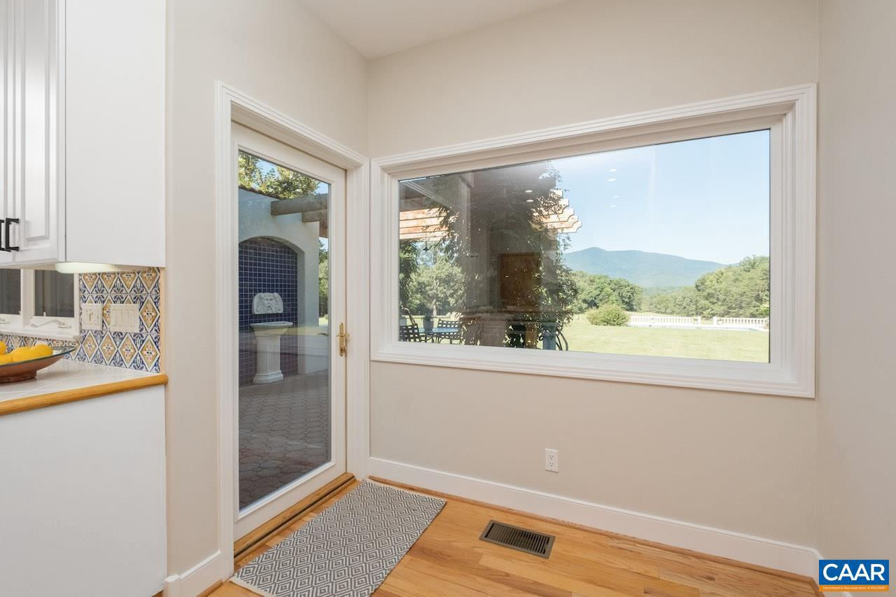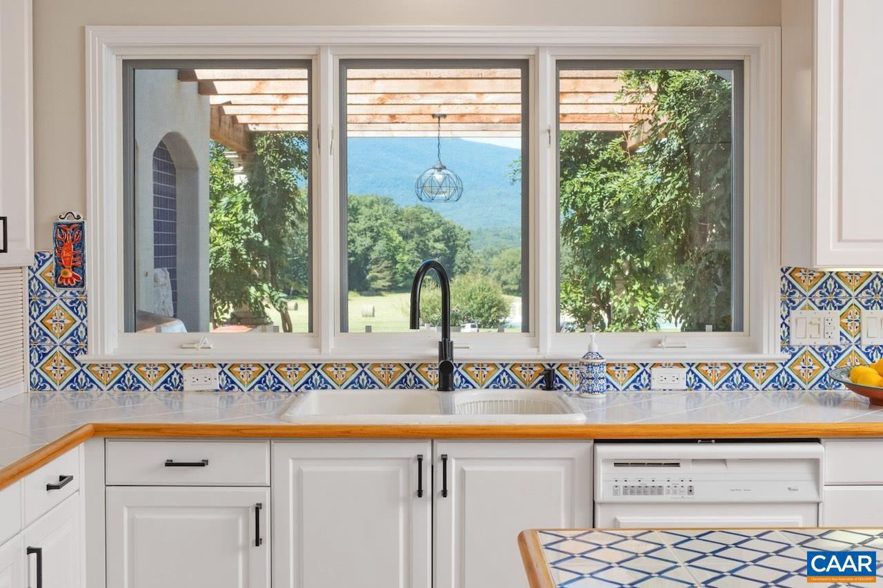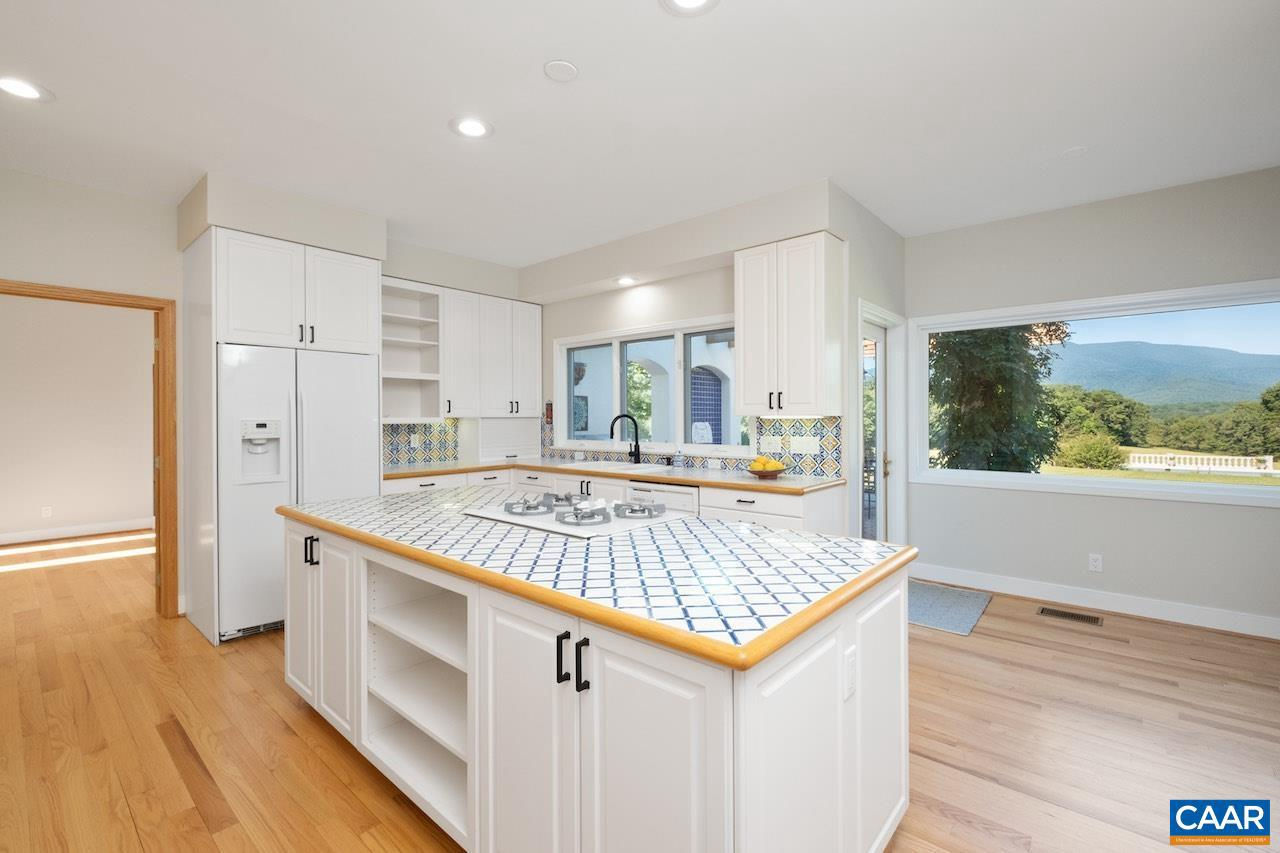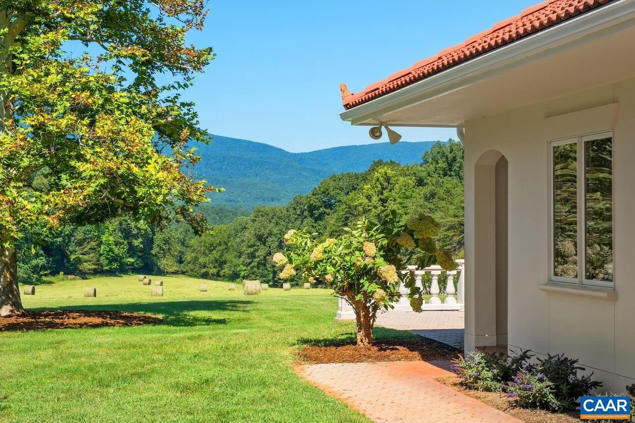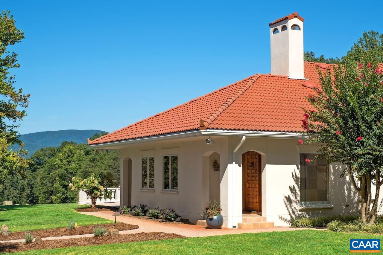 Open House Sept 14 1-4pm. Mediterranean inspired and designed with amazing mountain views and privacy! The approach to the home is magnificent, but the views upon arrival will take your breath away. Be mesmerized by the sweeping pastoral and mountain views from inside with large windows to frame the view and from outdoors - arbor covered courtyard with water feature, patio, deck, or pool and small pool house with mini kitchen. Comprised of nearly 100 acres with an estimated 30+ acres of pasture and balance in woods and creeks for hiking or exploring AND includes 2 extra parcels if family wants to build nearby. The architectural design and Smith and Robertson custom construction brought the owner's vision to life with custom details in porches, arches, lighting, and handcrafted tiles. Features: vaulted ceilings, sky lights, hardwood floors, wood trim and doors, wood stove insert, fiber optic internet, spacious rooms and many extra living spaces such as home office, den, upstairs guest suite or apartment with mini kitchen, and a basement offering space for recreation, exercise, guests, or storage. Coveted Afton location only 1.5 miles to Rt 151 and the wine and brew trail, 10 min to Nellysford town hub, and 30 min to Charlottesville,Tile Counter,White Cabinets,Fireplace in Living Room